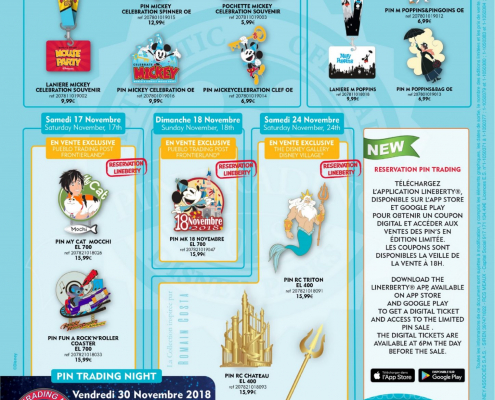 Disneyland Paris, Le MerchandisingL’affiche Pin Trading de Disneyland Paris pour le mois de Novembre 2018 est arrivée !Le Samedi 3 Novembre, la Mickey 90 Mouse Party est à l’honneur avec toute une collection comprenant trois pin’s, une lanière et une pochette…